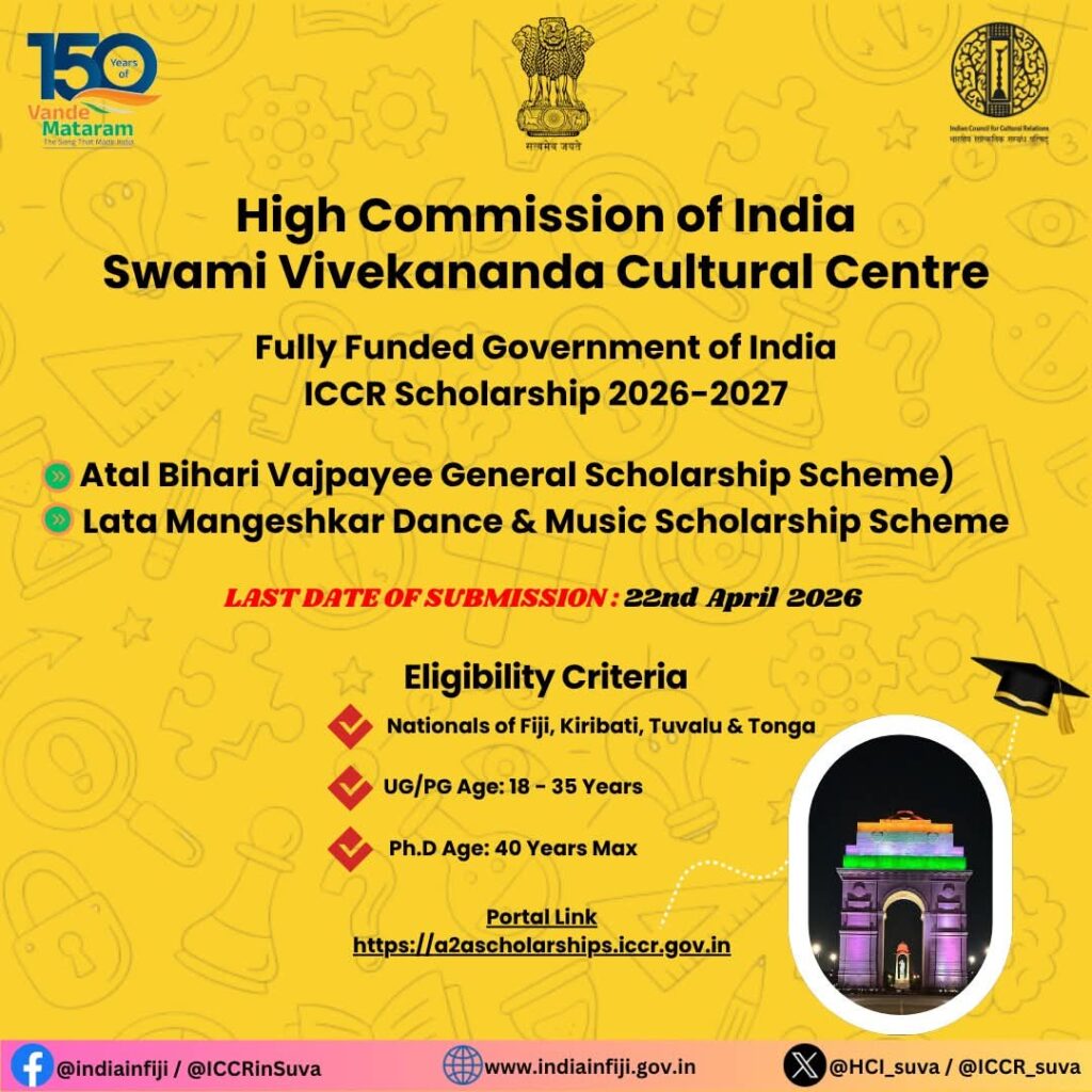 Government of India – ICCR Scholarships for AY 2026-2027 Posted on April 19, 2026April 19, 2026 by root Click this link to visit the >>>Scholarship Portal Click these links to download the >>>Guideline and >>>Scholarship Scheme.
